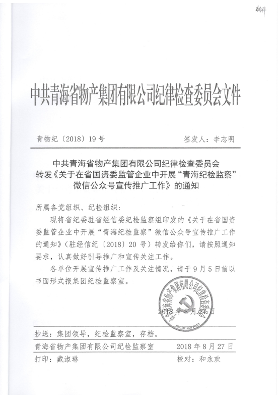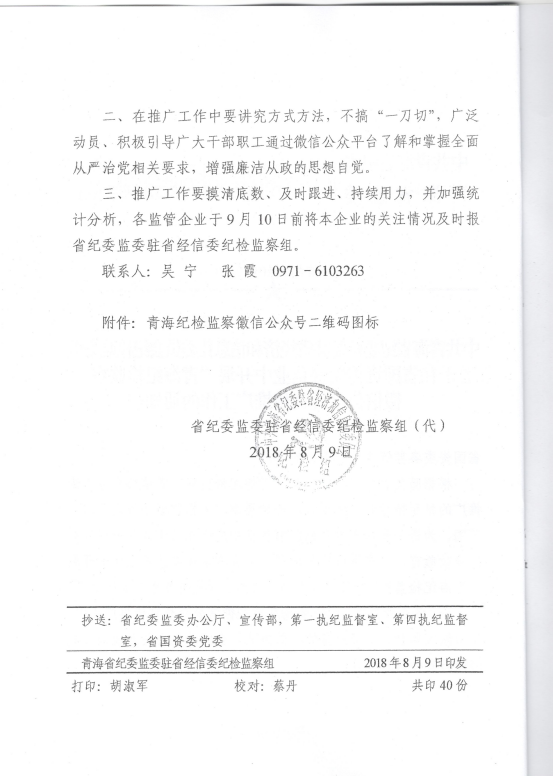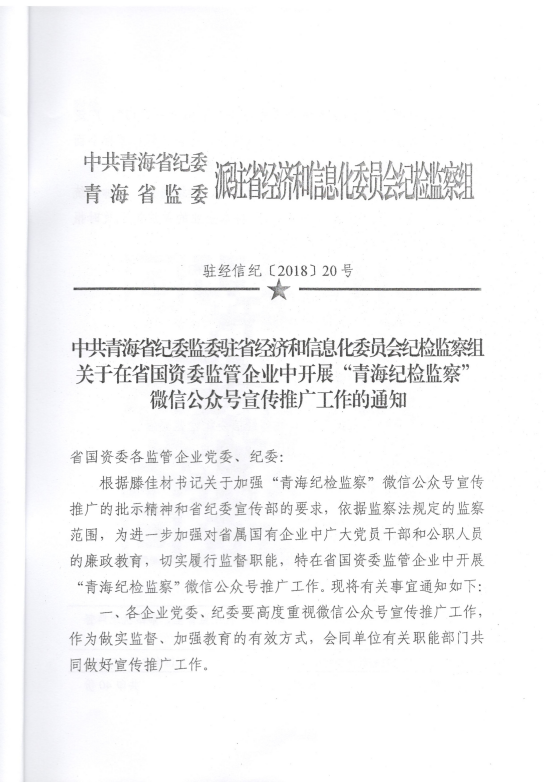 轉(zhuǎn)發(fā)《關(guān)于在省國(guó)資委監(jiān)管企業(yè)中開展“青海紀(jì)檢監(jiān)察”微信公眾號(hào)宣傳推廣工作》的通知