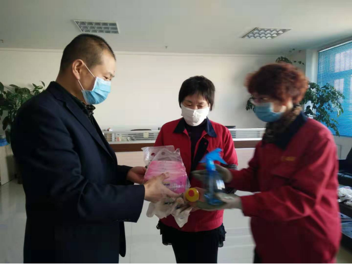 守護職工筑牢"安全防線":物產配送公司黨委通過配發酒精40公斤、84消毒液6瓶、消毒濕巾等防控器具,及時組織黨員指導職工進行防控工作,重點對宿舍、辦公室、值班室、洗手間門把手、辦公桌椅等進行噴灑消毒。