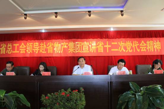 劉西昆主任對強衛書記在省十二次黨代會上所做的工作報告,分省十一次黨代會以來的五年工作回顧總結、省十二次黨代會確定的"兩新目標"、"三區建設"、"一個保證"等四個部分,緊密結合工會工作實際向與會人員做了主題鮮明、內容翔實、具體生動、樸實簡練的宣講和解讀。并強調,物產集團兩級工會組織、工會干部要高舉中國特色社會主義工會發展道路偉大旗幟,充分發揮工會組織作為國家政權的重要支柱作用、聯系職工群眾的橋梁紐帶作用和職工群眾的權益維護者作用。努力在推進"三區建設"、企業發展中踏實干事,創先爭優;努力在構建和諧勞動關系、營造積極向上的企業文化中勇于實踐、爭創一流;努力在開展"下基層、接地氣、辦實事"服務職工在基層活動中深入一線、解決問題。
