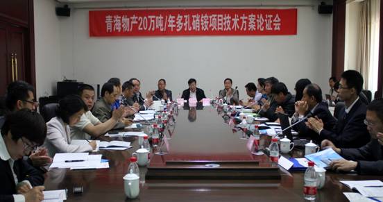 青海物產工業投資有限公司20萬噸/年多孔硝銨項目技術方案論證會于2013年5月17日-19日在青海西寧召開,省物產集團總公司總經理王玉輝、副總經理耿保平、北川工業園管委會副主任薛萬革、建行西寧支行副行長王硯宏蒞臨會議指導,會議由物產工投常務副總經理常海寧和專家委員會主任分別主持。煙臺萬華高級工程師王全文、山西天脊高級工程師劉金亮、湖北鐘祥凱龍高級工程師楊國富、華陸工程科技有限公司教授級高工劉艷軍、陜西興化工程師馮衛、物產民爆總經理袁海玲、物產工投高級工程師薛玉貴、華陸工程科技有限公司副總經理齊吟、賽鼎工程有限公司商務部副主任劉軍彪及相關主設人員、項目建設單位代表等共36人參加了會議。專家委員會推選楊國富擔任主任委員、袁海玲擔任副主任委員。
